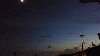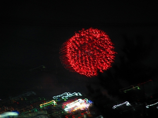ひどい花火の写真ですが~~<m(__)m>これしかないので、、雰囲気を味わって下さい。空には丁度半月のお月様がきれいでした。