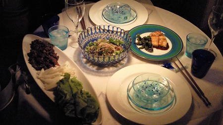 鰹のたたきのオクラ、茗荷、大葉の酢の物、、、海老、大葉、白ネギ入りの餃子、、、デザートには西瓜。