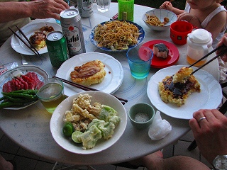 雑多な夕食!・・お好み焼き、焼きそば、松茸の天ぷらをお嫁ちゃん用、娘夫婦用と先に作ってパッキングしてから食べました。帰りに娘のところに立ち寄って、昔懐かしい我が家のお好み焼きを届けました。