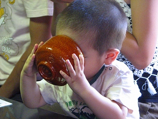 水遊びを終えてから母が準備してくれた「お盆のお茶席」を楽しんだのです。孫もすっかり慣れたものです。