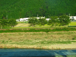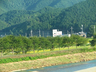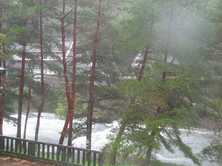 向かいは「みのり館」が見えています。多々良木(たたらぎ)の関西電力の水力発電所のダム湖の水の放流が始まり、大雨なのですが、きれいな水が恐ろしげな勢いで小さな川を水が流れています。