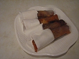 ④春巻き・・我が家は切らずにキッチンペーパーを巻いて食べます⇒空腹も頂点に達しているのに、わざわざ春巻きを作るか~~?・・夫に巻いてもらいました^_^;・・少しパンクしそうな巻き方~~。