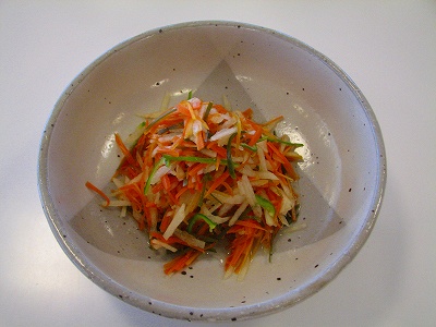 人参・・2本 リンゴ・・1個 レモン汁・・1/3個分、オリーブオイル・・小さじ1 その日によって新鮮な小松菜かキャベツがあれば少し加えます。