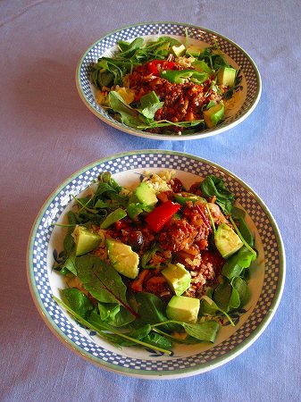 ミートソースとタコソース(サルサソース)が余ったので、昨日のお昼は「タコライス」にしまhした。先日の台風以来、葉物が高騰。レタスも売っていなかったので、レタスは使えずベビーリーフを使用しました。