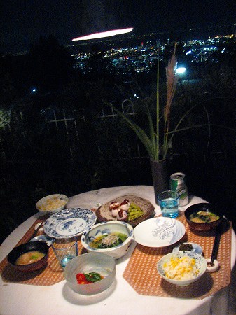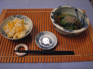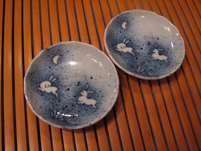 セッティングは箸置きは満月を意識して、白い丸い箸置き、豆皿は月と兎。取り皿は先月購入した波の皿(先月は玄関に飾っていました^_^;)、飯茶碗はふきつけ。
