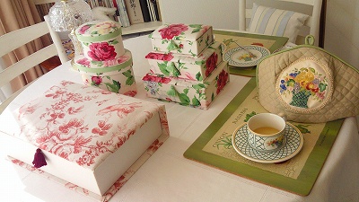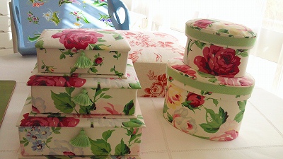 それからラブリーな箱の数々。カルトナージュをたくさん作っていらっしゃいます。作り方などに花がさきました。時間を作って是非教えていただきたいと思いました。・・・・ここに出ていないボックスもたくさんあります。