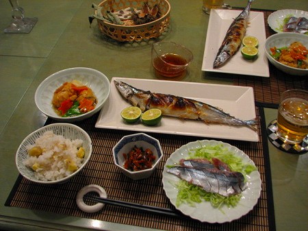 「さぁ、私が釣ってきた、秋刀魚でお食事!(^O^)/」と、焼きたて秋刀魚、〆秋刀魚の新鮮で美味しかったこと!!